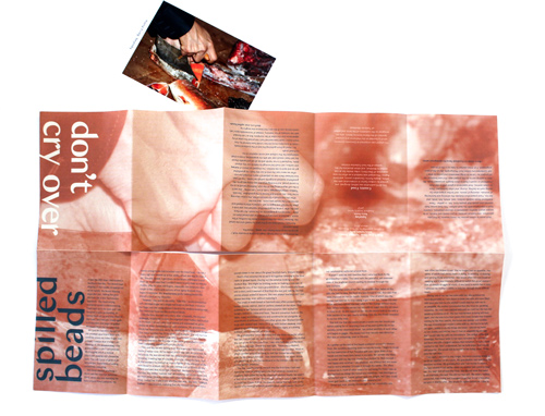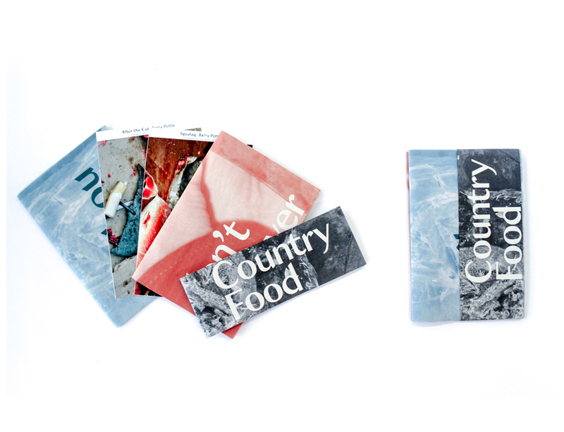 For this limited publication, artists Barry Pottle and Adina Tarralik Duffy generously allowed their work to be featured. Pottle is an Inuk photographer whose Foodland Security series captures the difficulties of maintaining security of traditional foods for urban-bound Inuit people. This double booklet series showcases Duffy’s stories that illustrate the author’s relationship with food and family. Unfolding each booklet reveals a large format monochromatic photo from Pottle’s series.